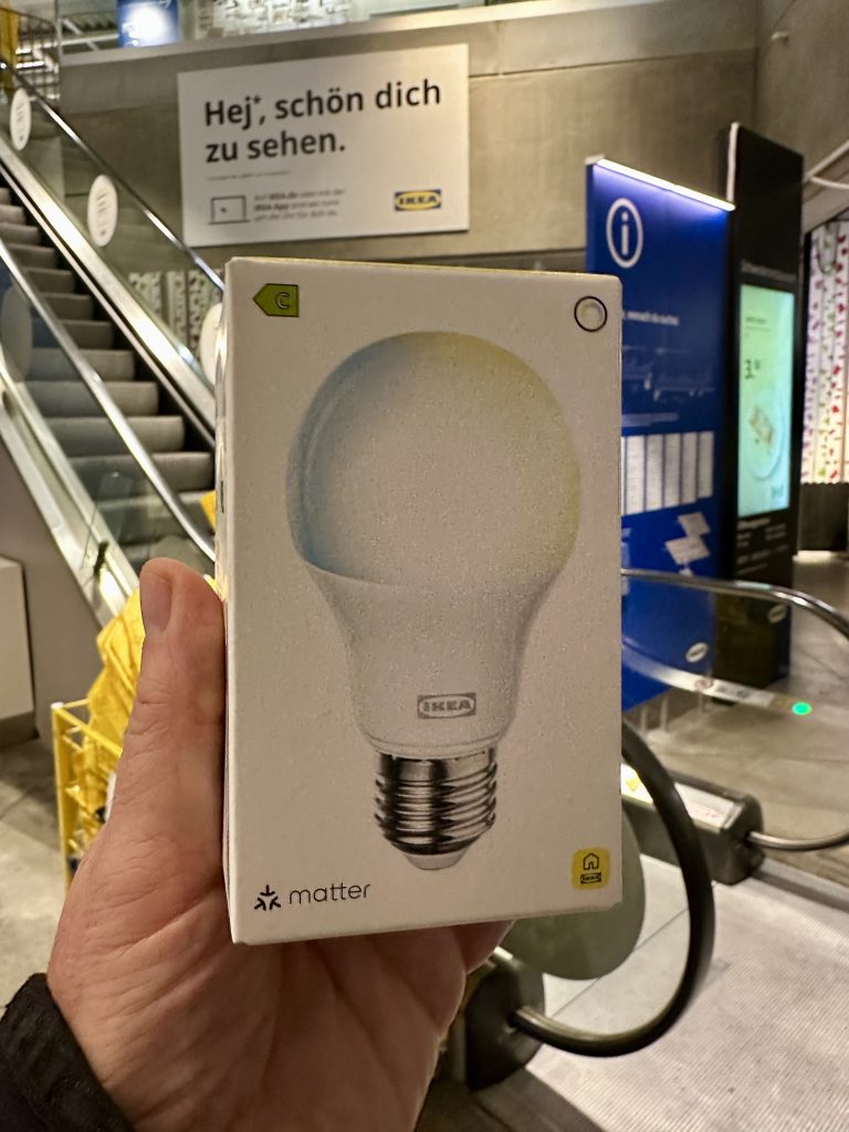 IKEA hat eine ganze Reihe neuer Gerätschaften mit Matter-Support. Wir haben auf die Schnelle eine Lampe mit viel Licht gewählt, die aber kein farbiges Licht produzieren kann. Unsere Hue-Lampen haben wir kaum jemals in anderer Farbe als warmweiß leuchten lassen.