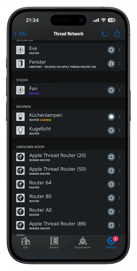 Wie man sehen kann, habe ich sehr viele Router. Das sind alles interne Knoten des Thread-Netzwerks. Drei davon hat sich Thread als Border Router ausgeguckt, die verbinden das Thread-Mesh mit meinem (Wifi-)Heimnetzwerk. Das sind hier Apple HomePod mini. Der Übergang zwischen Thread und Wifi ist also redundant. Wenn ein HomePod bootet, beeinträchtig das nicht das Netz.