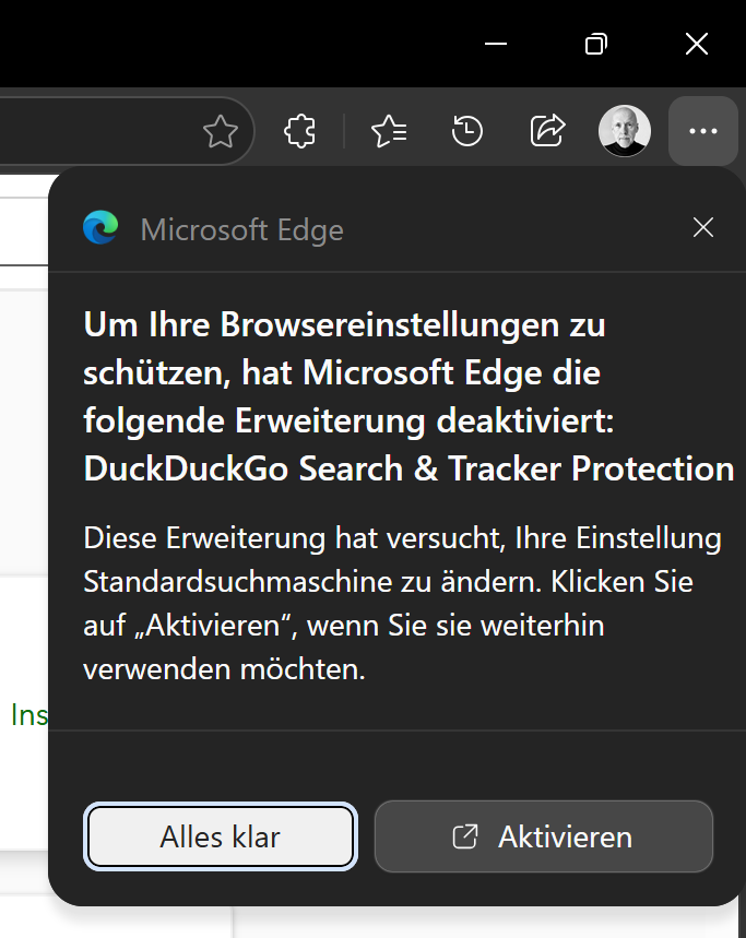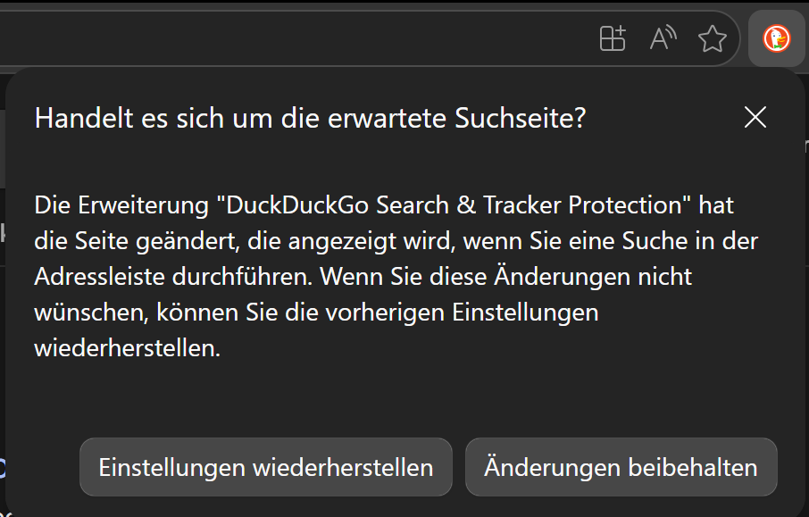 Update: Ich habe noch mal weitergeforscht. Erst die Duckduckgo Extension entfernt und dann neu installiert. Das hat Edge ebenfalls nicht gepasst: