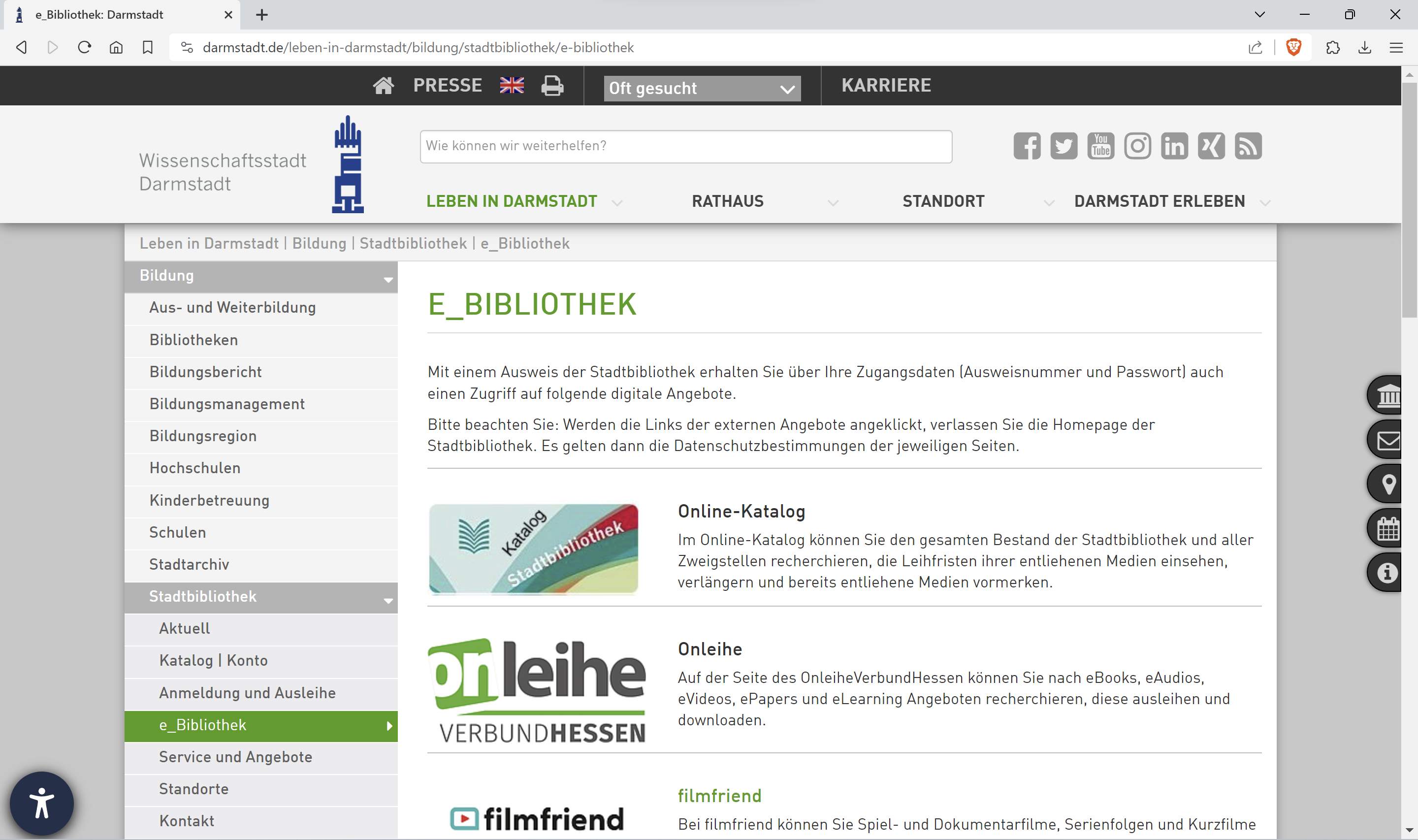 Schauen wir uns mal an, was die Stadtbibliothek der Wissenschaftsstadt Darmstadt anbietet. Hier könnt ihr das Angebot durchschauen, dann muss ich das nicht vollständig aufzählen. All das kostet 10 Euro im Jahr, mit ermäßigtem Beitrag für Kinder, Senioren etc.