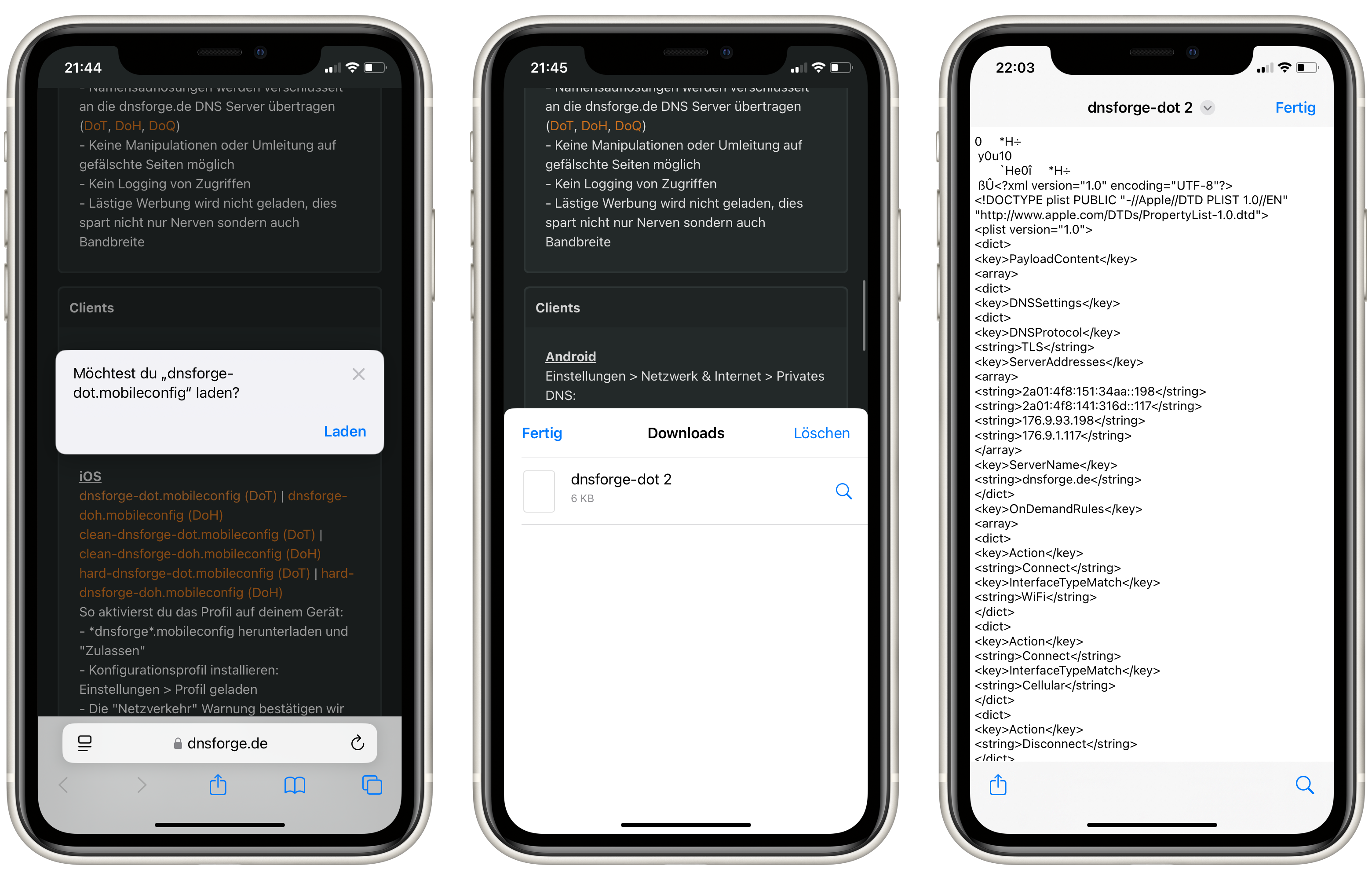 Unter iOS 17 war es möglich, ein Profil von einer Webseite über den Safari-Browser herunterzuladen und dann direkt in den iOS-Einstellungen zu installieren. Das ist unter iOS 18 nicht mehr möglich. Unter iOS 18 wird das Profil nur heruntergeladen. Safari unter iOS 18 fügt das Profil nicht in die Installationsliste hinzu. Beim Versuch ein heruntergeladenes Profil aus der Download-Liste zu installieren, wird nur der Klartext des Profils angezeigt.