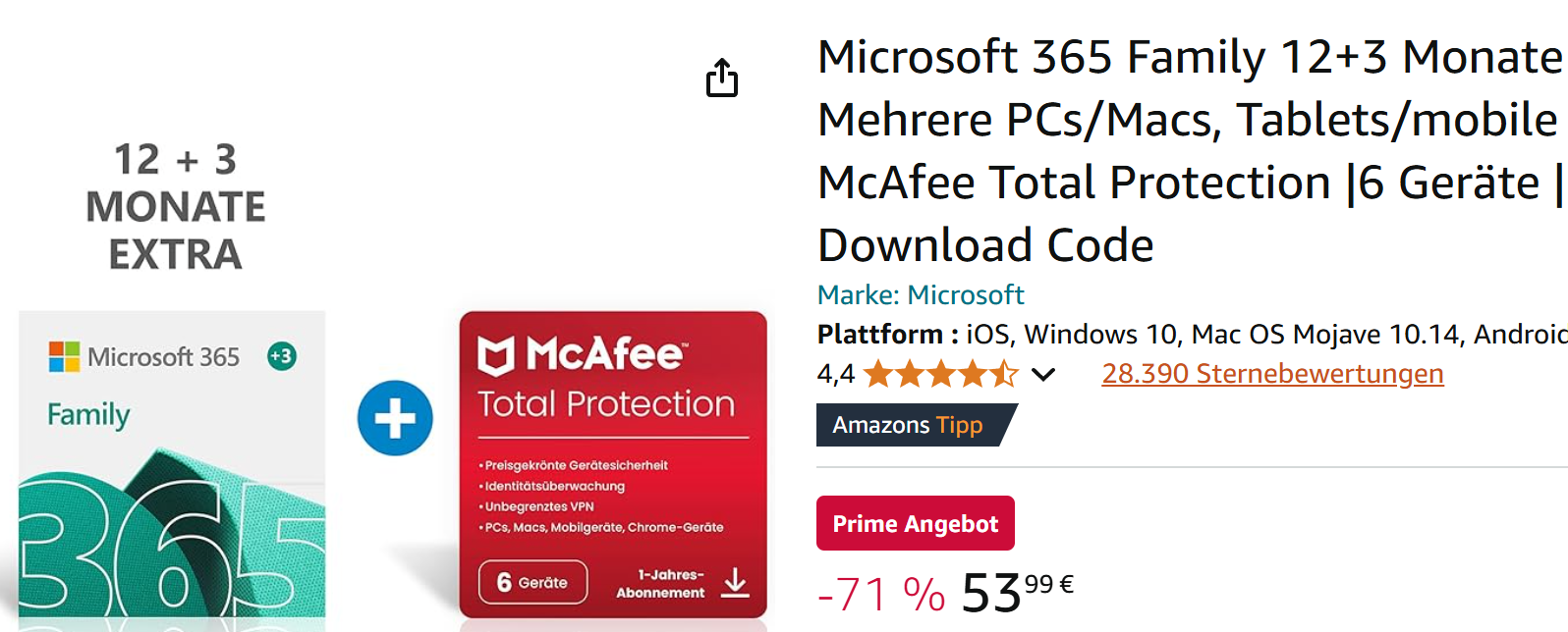 - Microsoft 365 Family 12+3 Monate. Automatische Verlängerung kann man im Msft-Account abstellen und den Antivirus-Quatsch installiert man einfach nicht.