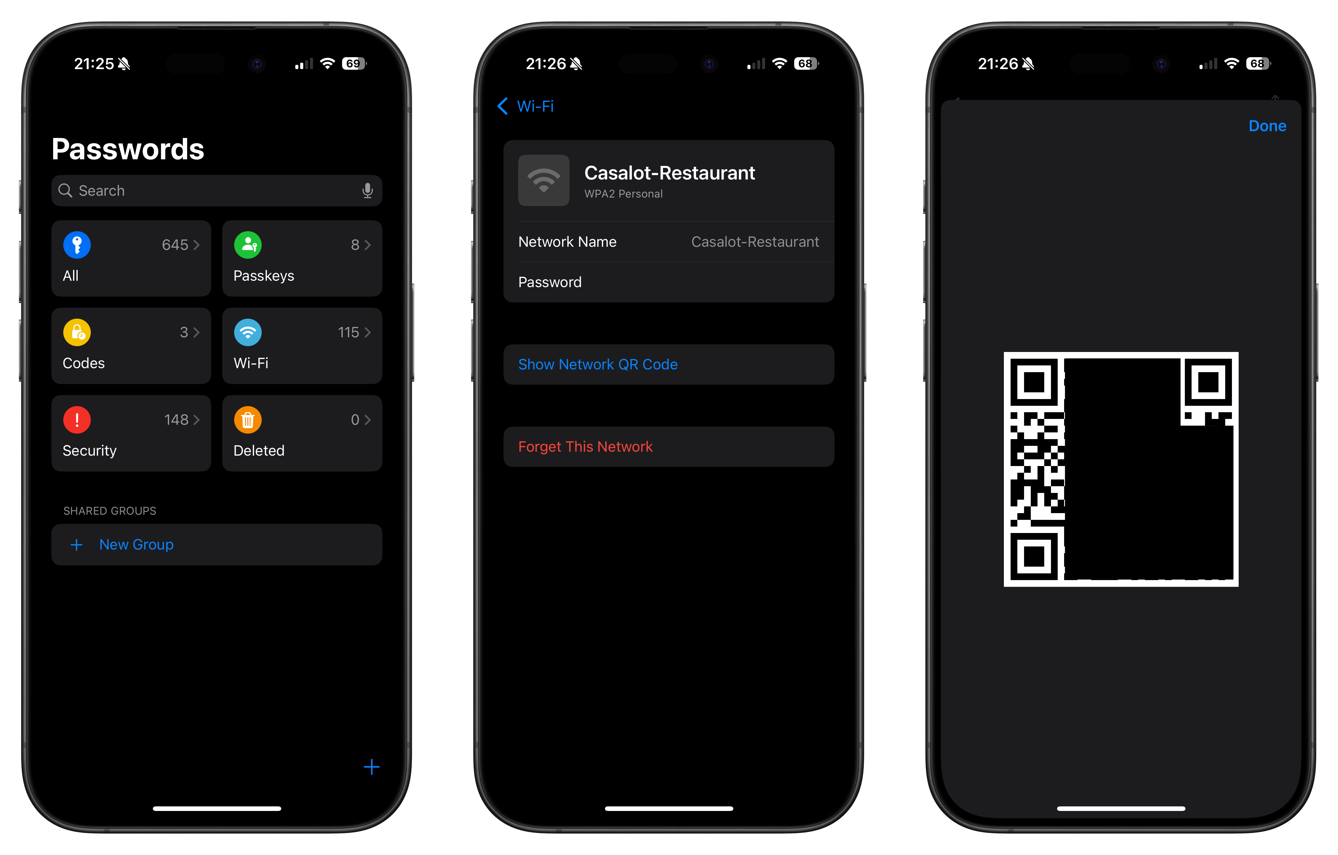 Apple devices have this neat feature to share Wi-fi passwords with other Apple devices, e.g., iPhone, iPad and Mac. With iOS 18 Apple introduced an easier way to share Wi-Fi credentials even outside the Apple ecosystem, e.g., with Android smartphones. Within the Passwords app you can display a QR code that can be used by any other device to join a Wi-Fi network. Open the Passwords app on your iPhone, navigate to the Wi-Fi section. The Wi-Fi network you are currently connected to is shown at the top of the list. All other Wi-Fi networks your device has saved, are shown in alphabetical order. Search for the Wi-Fi network you want to share and open that entry. Tap on Show Network QR Code. Scan the QR code with the camera app of the Android smartphone and the device will join the Wi-Fi network. The QR code can be used by Apple devices, too.