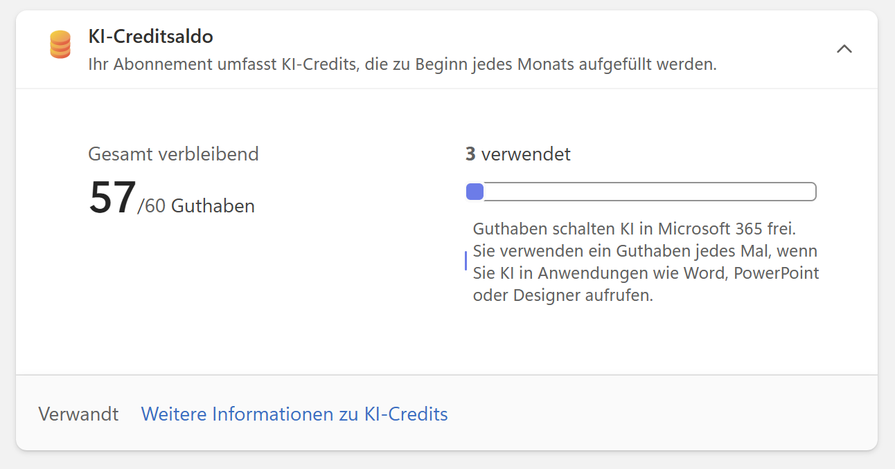 Aktuell gibt Microsoft jedem persönlichen Account (365 Personal oder 365 Family) 60 Gummipunkte im Monat mit, die man durch die Nutzung von Copilot in Office oder Windows aufbrauchen kann. Man kann das durch eine Pro-Lizenz aufstocken, aber ich habe den Verdacht, dass hier nur in homöopathischen Verdünnungen Geld fließt.