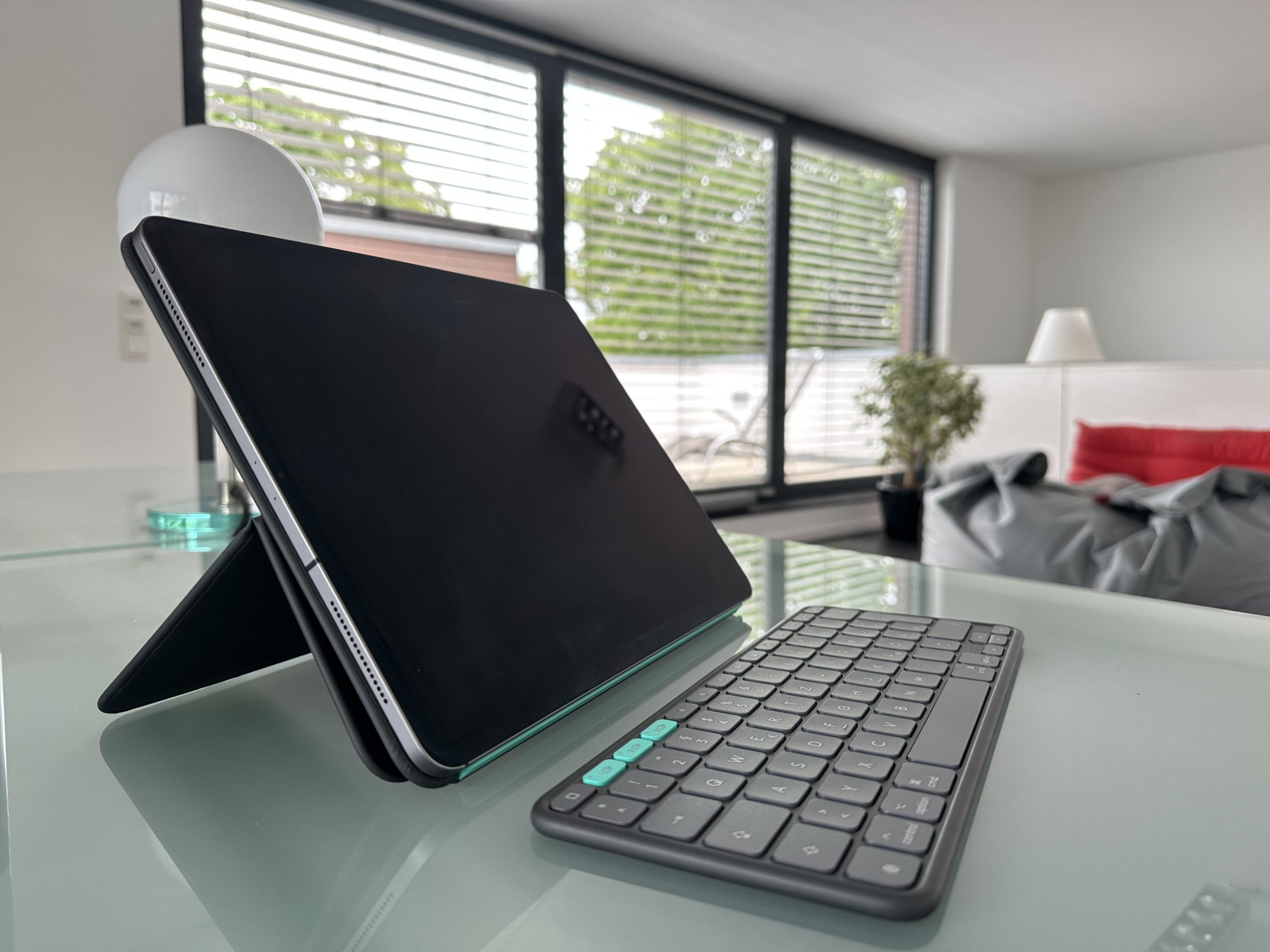 Was mir auch auffällt, ist das große Gewicht. Das kennt man bereits vom Apple Magic Keyboard. Mit dem iPad zusammen hat man damit ein Paket wie ein leichtes Notebook. Auch wenn Logitech nur eine Kompatibilität mit den neuesten iPad Pro und Air gewährleistet, haben wir es erfolgreich mit einem iPad Pro 3. Generation (2018) und einem iPad Pro M1 getestet.