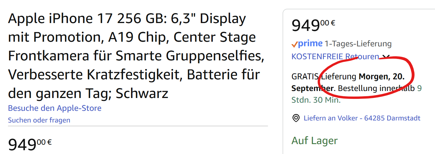 Meine Einschätzung war richtig. Es gab keinen Run auf die neuen iPhones und Amazon kann über Nacht liefern. Das “normale” iPhone 17 wäre meine erste Wahl. Es gibt Varianten mit 256 und 512 GB Speicher.