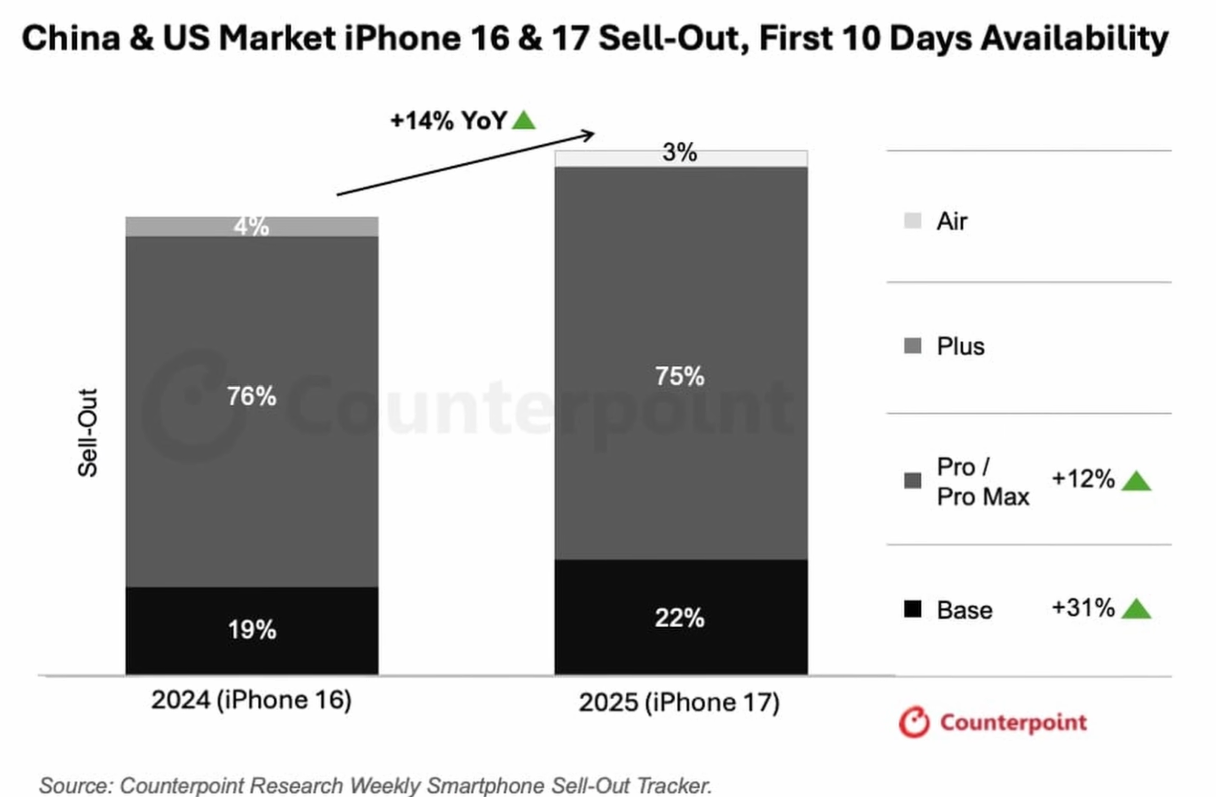 Interessanter Research von Counterpoint. iPhone 17 hat sich in den ersten zehn Tagen deutlich besser verkauft als iPhone 16, was ja auch eher ein lahmes Update war. Das Basis iPhone hat deutlich zugelegt und das iPhone Air verkaufte sich noch (relativ) schlechter als das iPhone Plus.