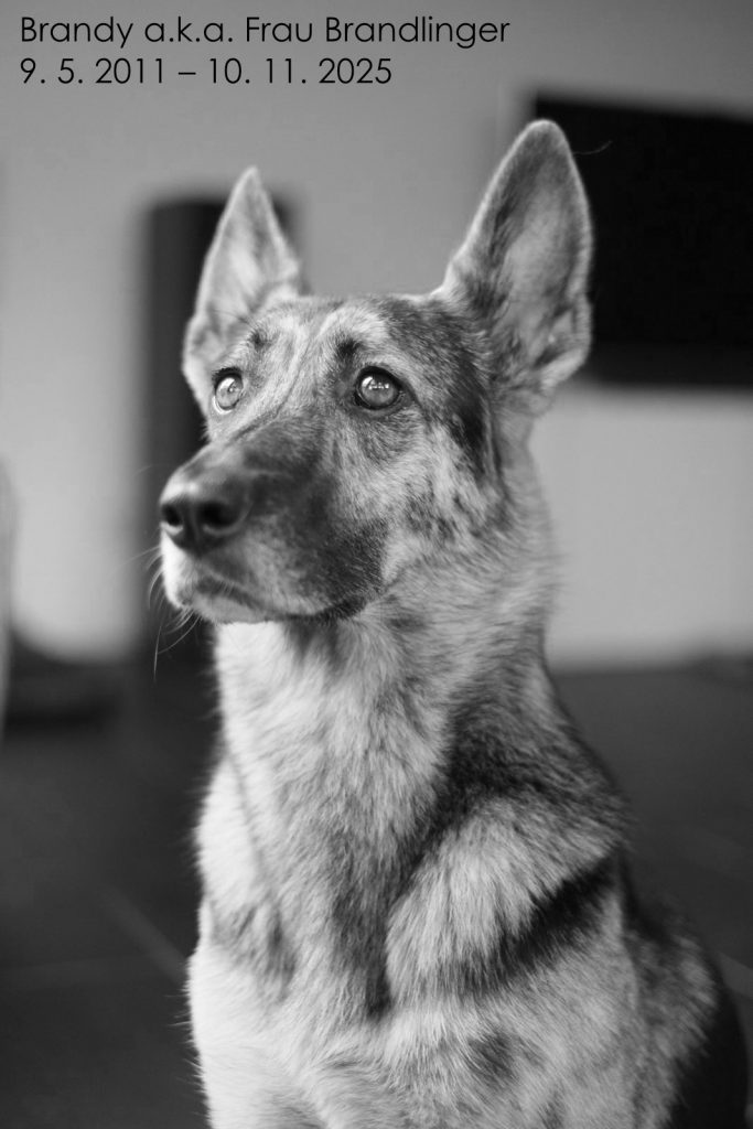 Frau Brandlinger war kein geselliger Hund. Freilaufend ist sie anderen Rudeln stets ausgewichen. Dafür war sie bekannt: Ein Hund, der sich ins Gebüsch schlägt, um dann zweihundert Meter später wieder aufzutauchen. Sie hat uns stets vor Eichhörnchen und anderen wilden Tieren beschützt. Wenn wir im Dunkeln einer fremden Person begegneten und sie tief grollend nach vorne ging, habe ich ihrem Urteil mehr vertraut als meinem eigenen.