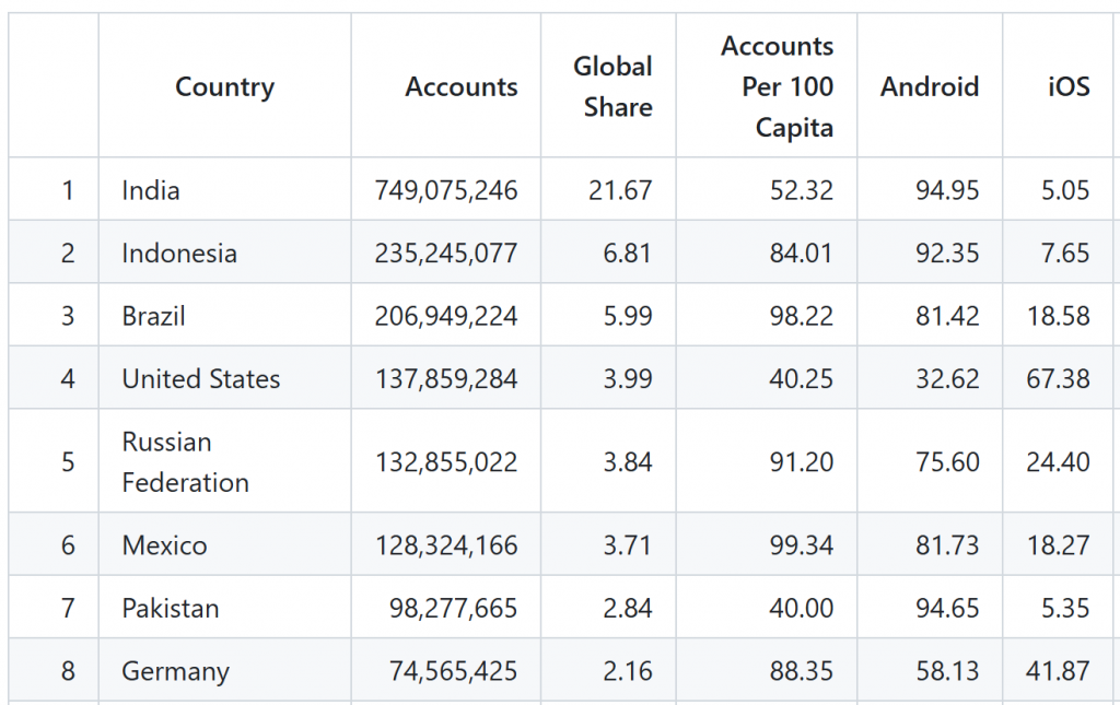Ein interessantes Forschungspapier gibt einen schönen Einblick in die WhatsApp-Nutzung. Mehr als 88 Prozent der Deutschen haben demnach einen Account. Ziehen wir die Kinder ab, dann haben viele Leute also mehr als einen. In USA sind es nur 40%, weil dort das iPhone mit iMessage dominiert.