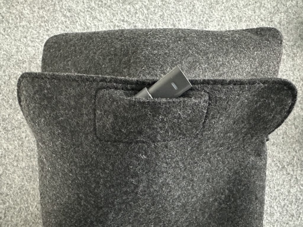 Man verstaut das Headset für den Transport in einer weichen Filztasche, die auch einen Platz für den Bluetooth-Dongle hat. Alle Stecker an Dongle und Ladekabel sind USB-C. Ein Adapter für alte USB-A-Anschlüsse liegt bei.