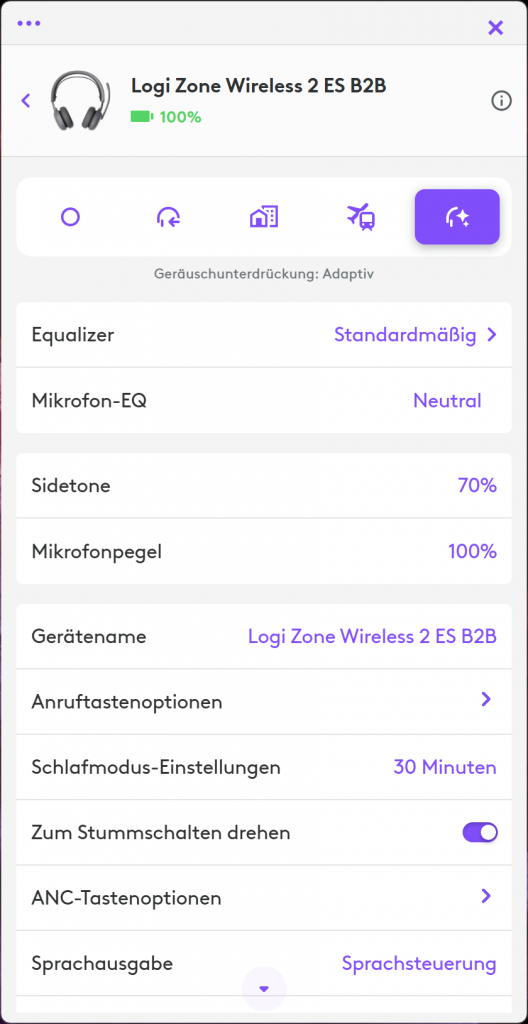Man kann das Wireless 2 ES auf drei Arten verbinden: per nativem Bluetooth, per USB-Dongle oder per USB-Kabel. Mit Kabel lädt der Akku und der Ton wird übertragen. Schaltet man es ein, dann wird der Akku weiter geladen, die Verbindung geht aber auf Bluetooth über und die aktive Geräuschunterdrückung (ANC) wird aktiv. ANC kenn fünf Einstellungen: Aus, Transparenz, Niedrig, Hoch und Adaptiv. Alle Headset-Einstellungen lassen sich per Logi Tune vornehmen: