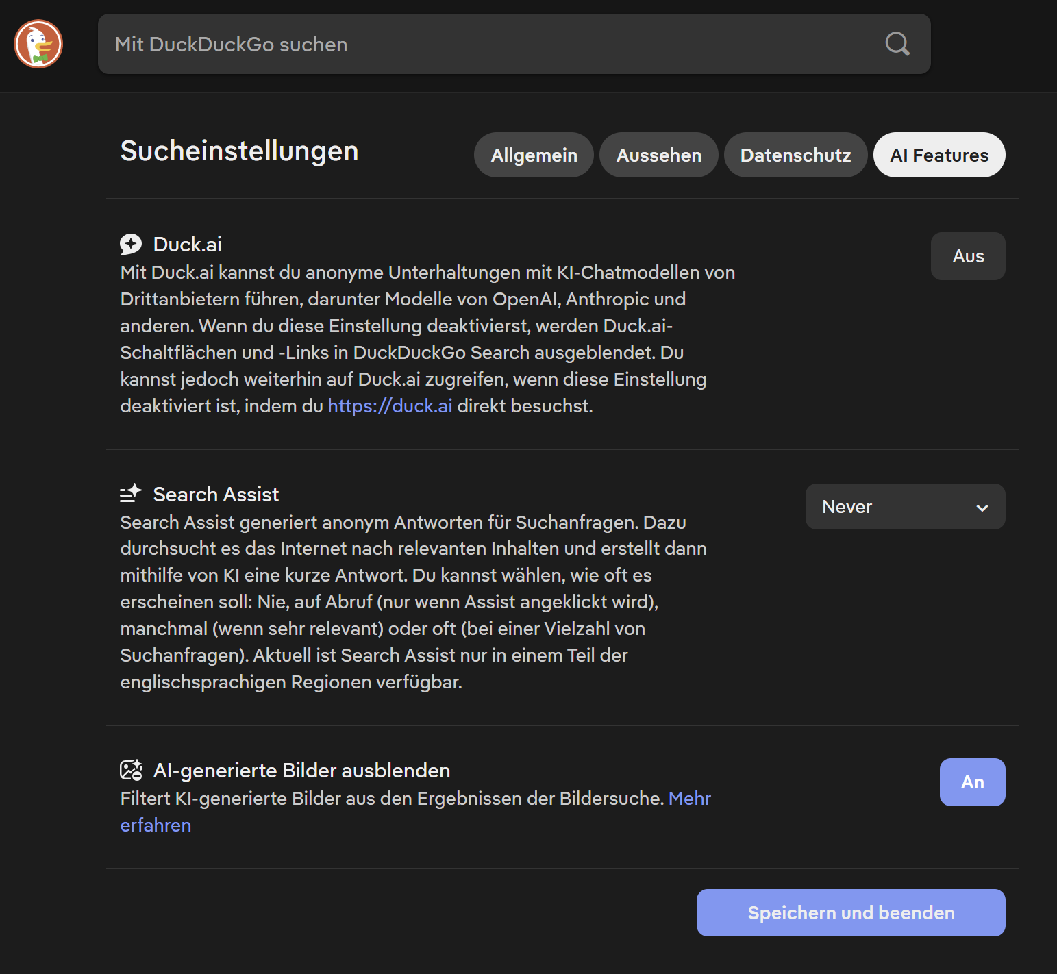 Ich finde seit Jahren mit DuckDuckGo anstelle von Google. Wenn man das Hamburger-Menü öffnet, findet man dort auch ein paar wertvolle Einstellungen, mit denen man AI Slop ausblenden kann: Duck.ai AUS, Search Assist NEVER und AI-generierte Bilder ausblenden.