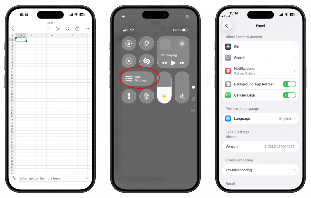 Man kann aber auch direkt dort hinspringen, indem man aus der App einen Shortcut aufruft. Der hat nur einen Befehl. Wie kommt man an den Shortcut? Man nimmt ihn in das Control Center auf. Beispiel Excel: