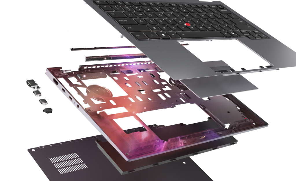 Die nächste Generation der X1-Flaggschiffe der ThinkPad-Reihe von Lenovo bekommen eine neue Konstruktion, die man als genauer Beobachter schon außen an dem eckigeren Rahmen erkennen kann. Das Unterteil der Laptops hat zwei Deckel. So kann man im Service-Fall von oben an Tastatur und Trackpad ran und unten an den Akku und andere Komponenten. Außerdem lassen sich nun die Ports einzeln austauschen. Das gibt sicher einen hohen Score bei der Reparierbarkeit.