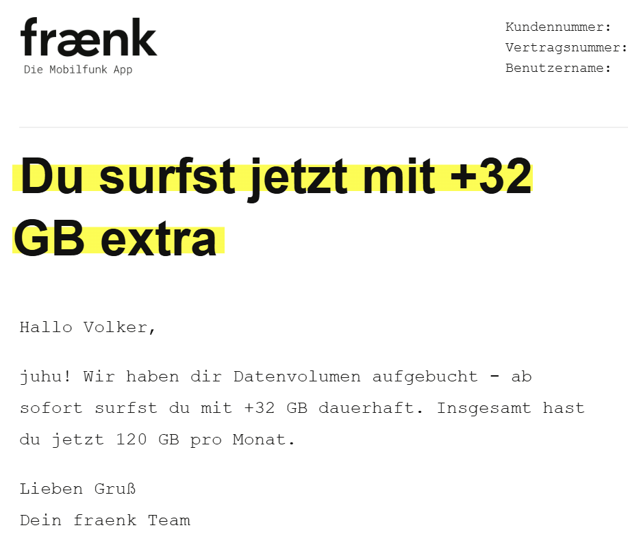 Gut zu wissen: Die Aktion startet am 02. März und es kann bis zu 14 Tage dauern, bis du die zusätzlichen GB bekommst und sie in der fraenk App zu sehen sind.
