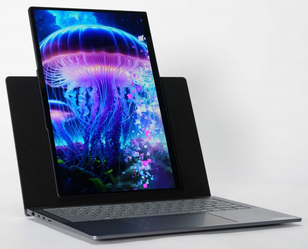 Und was wirklich nie enttäuscht, sind die ThinkBook-Designstudien, hier noch nicht als fertiges Produkt. Der Witz an diesem Gerät ist der drehbare Bildschirm, abwechselnd im Hoch- und Querformat. Der Deckel ist dabei doppelt und die Verkabelung des Displays ist spannend. Aber ich liebe solche Ideen, auch wenn sie sich wahrscheinlich nicht durchsetzen.