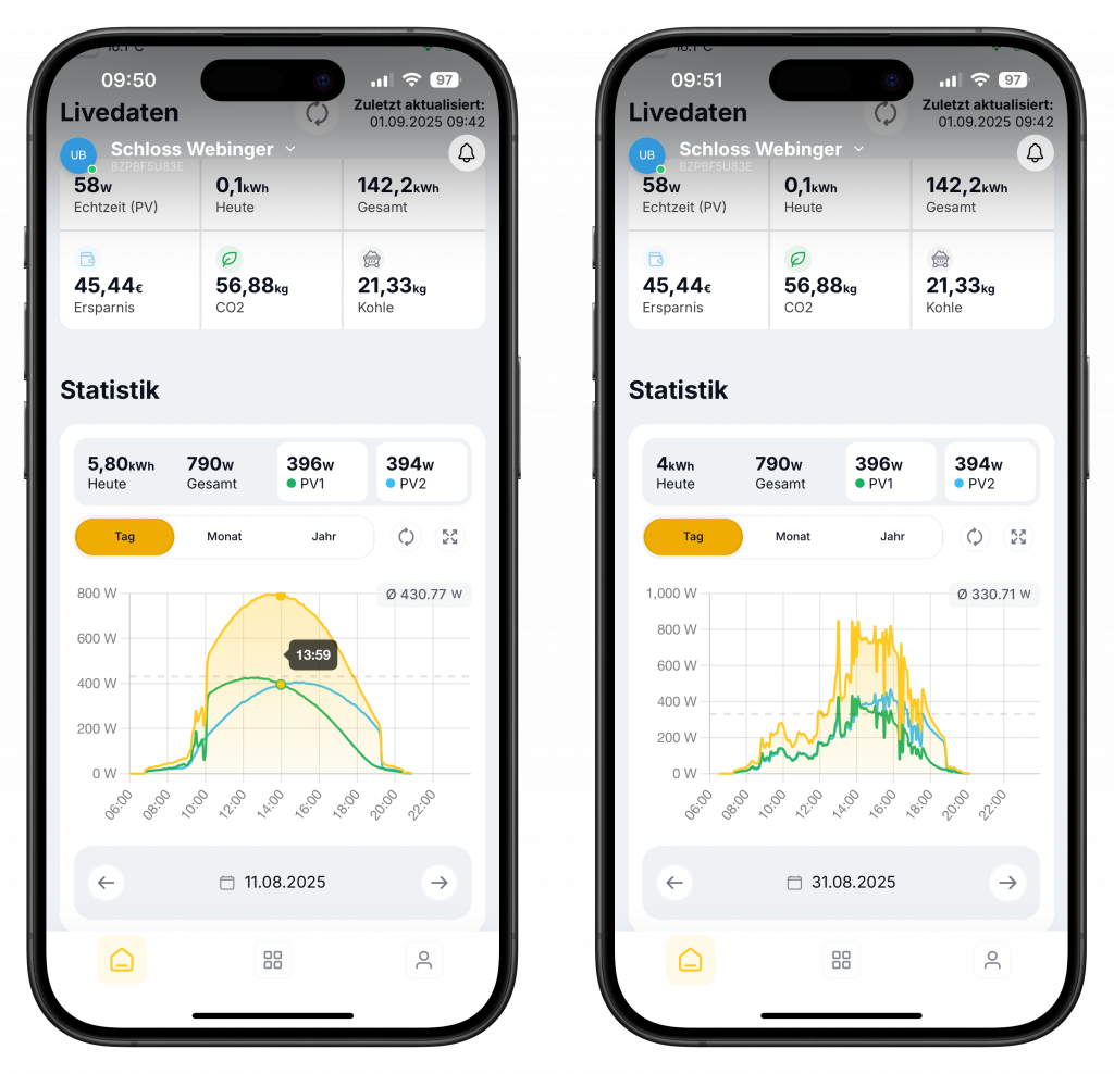 Vergleicht man die Kurven für den 11. und 31. August, so erkennt man, dass wir bis 10 Uhr morgens Schatten auf dem zum Südosten geneigten Morgen-Paneel haben. Etwa um 14 Uhr schneiden sich die grüne und die blaue Linie. Das nach Westen geneigte Paneels liefert danach einen größeren Beitrag. Abends um 19:30 liegt dann dieses Modul auch im Schatten. Die Schattenspender sind 12 bis 15 Meter hohe Bäume, über die wir uns sehr freuen.