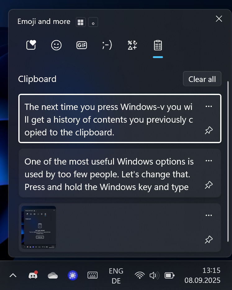 One of the most useful Windows options is used by too few people. Let’s change that. Press and hold the Windows key and type v. You will get this small window popping up. Now enable the feature.