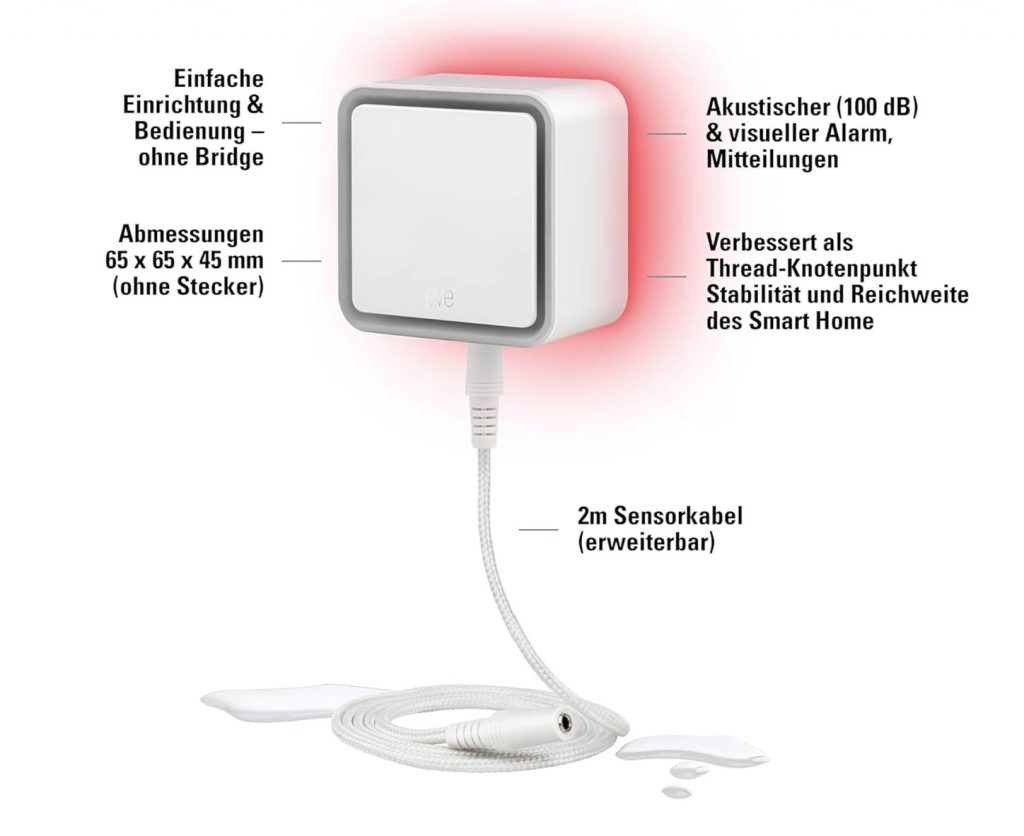 Wir haben zwei Eve Water Guard im Haus: Einer unter der Küchentheke wegen der Spülmaschine, einer im Heizungskeller. Der Water Guard hat ein stoffummanteltes Kabel, dass einen Stromkreis schließt, wenn es feucht wird. Das im Keller hat mehrere Verlängerungen bis hinter Waschmaschine und Trockner. (Längere Strecken lassen sich auch mit einem einfachen Audiokabel überbrücken.)