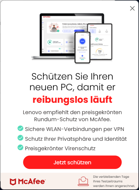 Das Modell, was ich mir angeschaut habe, ist ein 21TR0004GE mit Intel Core Ultra 7 258V, 32 GB RAM und 1 TB großem Massenspeicher und Windows 11 Pro. Was mich ehrlich wundert, ist die Vorinstallation von McAfee und LinkedIn Crapware. Außerdem wurde es mit Lenovo Vantage statt dem weniger aufdringlichen Commercial Vantage ausgestattet. Das ließ sich aber über den Microsoft Store problemlos austauschen.